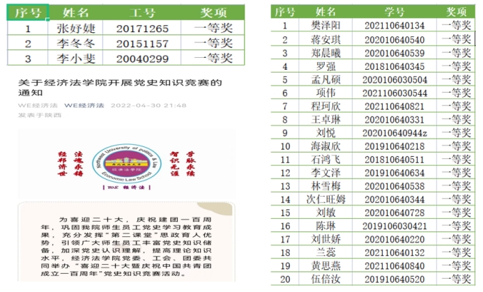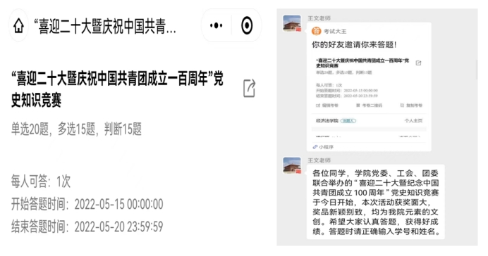 创新竞赛新形式,本次知识竞赛活动全程线上进行,活动前期通过学院官方公众号“WE经济法”进行宣传;竞赛期间各党支部书记、辅导员、工会小组长积极组织学师生员工通过微信小程序参与竞赛。