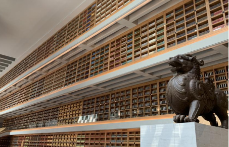 师生们拾级而上,登上文济阁,版本馆全貌尽收眼底,中轴对称式布局体现出北方园林的庄严肃穆之感;踏入保藏中心序厅,一排长90米、高20米的四层巨型通顶书墙映入眼帘,寓意守护的天禄和麒麟雕塑摆放在两侧,书墙陈放着上万册不同时期不同版本的卷轴、线装书籍、古籍,充分展现西安国家版本馆浓郁厚重的文化底蕴。在了解到西安国家版本馆作为中国国家版本馆“一总三分”的分馆之一,将带有中华文明印记的各类版本纳入其中,着力打造独具特色的中华版本资源集聚中心、西部区域中心和地方特色版本中心,承担中华版本保藏、展示、研究与交流功能等情况后,党支部师生党员们对以习近平同志为核心的党中央积极推进文化安全顶层设计的重要战略举措由衷赞叹。
