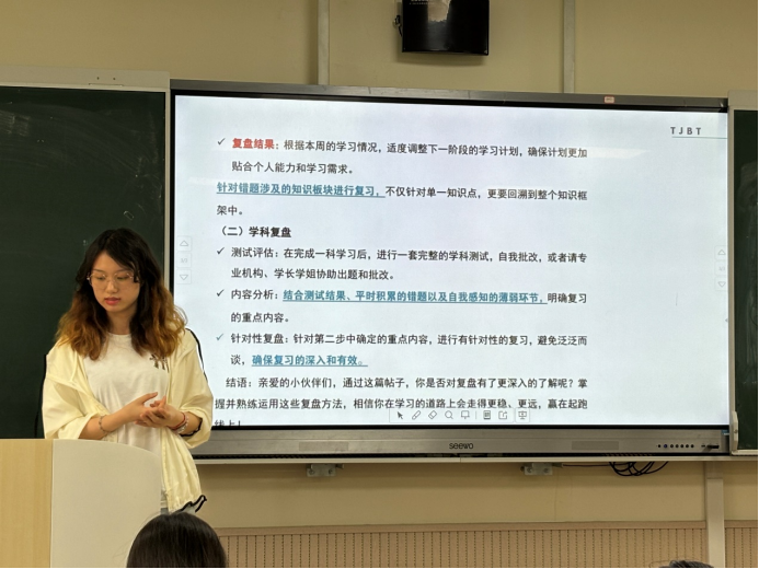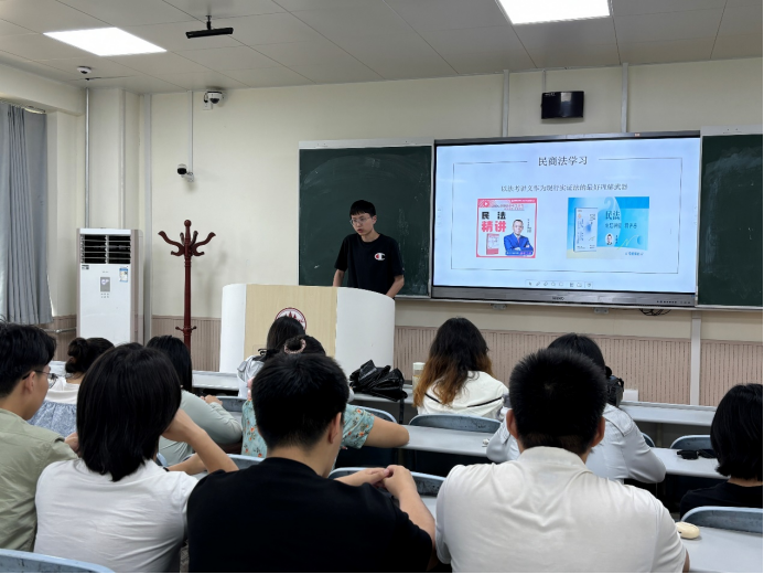 宣讲会上,周星宇同学为大家分享了民商法学习的经验和方法,借助法考书、教科书等资料进行入门和知识更新。他表示,大家可以在考虑兴趣和未来规划的前提下选择考研、法考、就业、公考等不同路径,还分享了自己平时的学习小技巧和线上课程,希望能为大家的学习有所帮助。