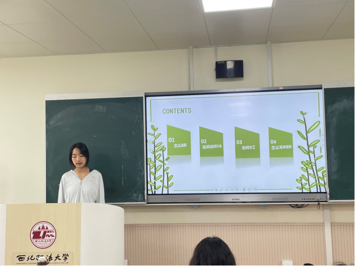 韩凯欣同学为大家分享了准备大学生创新创业大赛此类比赛的经验和方法,如怎样选题、如何选择队友、如何分工、以及怎样填写申报表,着重提示大家在选题时要注意热点话题和突出难点,结合团队总体水平确定方向,根据研究方向选择队友,取长补短地进行任务分配,填写申报表要重视格式和排版,需要多次检查等等,希望能在这些比赛中对大家有所帮助。