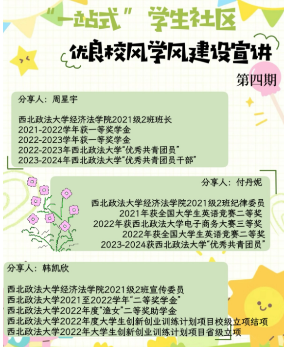 电子商务大赛三等奖获得者2021级2班付丹妮;2022年度大学生创新创业训练计划项目校级立项结项、省级立项、2022年度“渔女”二等奖助学金获得者2021级2班韩凯欣进行宣讲。