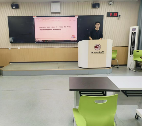 杨老师以PPT的方式向帮助同学们解决备考过程中的问题,分享备考经验和策略,带领同学们大致的分析了考研的科目以及分值的分布,全面的介绍了备考所需了解的基本知识。同时,杨老师深入地剖析考研的择校问题,在对于成绩的分析基础之上为同学们介绍了学校选择的重点。