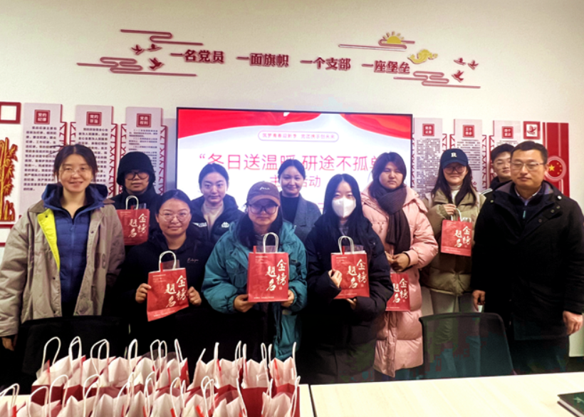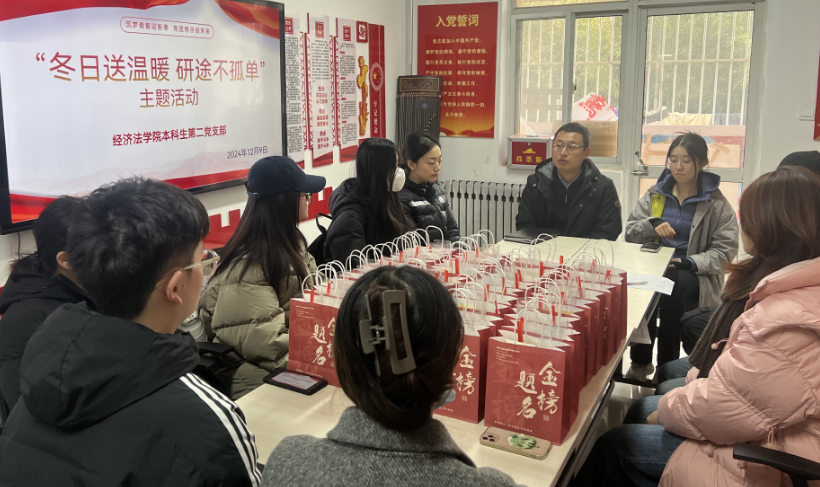 本科生第二党支部联合2021级9班团支部在“一站式学生社区”开展“冬日送温暖,研途不孤单”考研冲刺动员大会,为考研学子送上考研暖心礼包,护航研途“最后一公里”。本科生第二党支部书记李冬冬,辅导员郗姝涵及2025届考研学生代表参加本次活动。