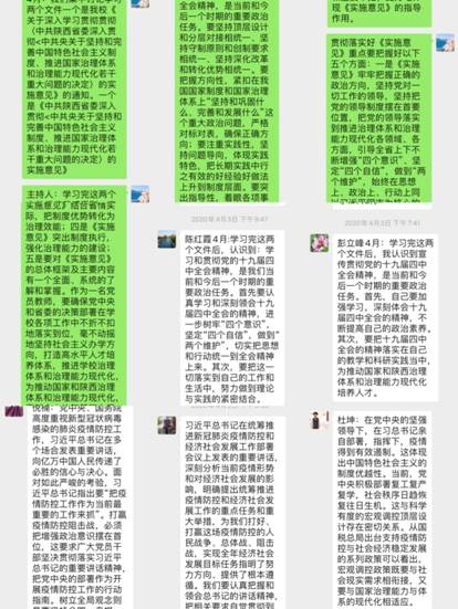 经济法原理教研室党支部利用“腾讯”视频会议、微信群等线上学习工具,学习当前习近平总书记关于疫情防控的相关指示、中共中央政治局常务委员会关于研究当前新冠肺炎疫情防控和稳定经济社会运行重点工作会议精神等内容,充分发挥党员的先进性,提高认识,提高觉悟,为“疫情防控,停课不停学”贡献党员的一份力量。此次线上主题党日活动,本支部主要集中讨论学习了我校《关于深入学习贯彻〈中共陕西省委深入贯彻<中共中央关于坚持和完善中国特色社会主义制度、推进国家治理体系和治理能力现代化若干重大问题的决定〉的实施意见》的通知和《中共陕西省委深入贯彻<中共中央关于坚持和完善中国特色社会主义制度、推进国家治理体系和治理能力现代化若干重大问题的决定〉的实施意见》。党员老师们热情参与,结合自身的感受在线上交流分享,为疫情防控和学校事业发展凝聚党员力量。