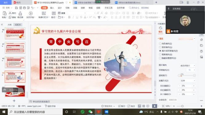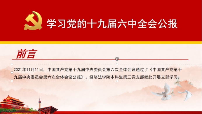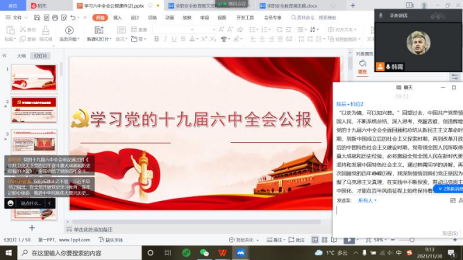 本科生第三党支部组织支部党员、入党积极分子集中学习十九届六中全会公报。本次支部学习以线上腾讯会议的方式进行,支部党员韩霄主持并带领学习。