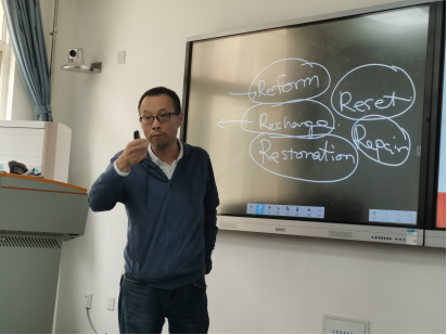 会议伊始,杨为乔老师进行了一场迷你的“大学笔记展”,展示了自己求学时期的笔记,其中既有严谨细致的知识记录,又有活泼可爱的少年情怀。杨老师既详细精到地讲解了建立知识体系,突出重点问题的实用笔记方法,又幽默风趣地分享了自己或“老土”或“成熟”的“名言警句”,小插画和小作文,一页页笔记既是对学海无涯的探索日记,又是对时代人生的痕迹剪影,屡屡激起同学们的笑声和掌声。审视生活,杨老师认为有5个Re开头的单词值得和同学们一同分享,分别是reform,reset,restoration,repair和recharge,以此引导同学们要有豁达的生活态度。