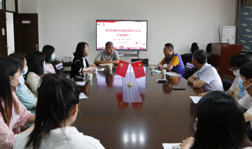 在学院资料室举办了西安怡康医药连锁有限责任公司专场招聘会。西安怡康医药连锁有限责任公司招聘部部长魏铁军、招聘主管雷昭君、学院党委书记李建梅、党委副书记李慧军、毕业年级辅导员张兴浩及部分2022届毕业生参加了此次宣讲招聘会。