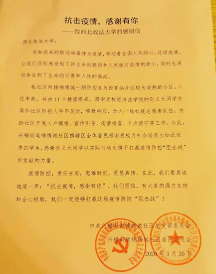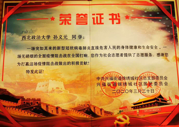 疫情初期,他发现很多社区工作人员在中午人流量最大时总是难以抽出时间吃饭后,便用自己的零花钱到超市为工作人员购买了些食物,给忙碌的他们填补肚子、补充体力。尽管用的是自己的钱,但他觉得自己这样做非常值得。防疫工作者们的精神也始终激励着他在志愿服务中始终保持细心严谨的态度,磨练自己吃苦耐劳的品格,为国家和社会多做一件事、多出一份力。孙义元同学无私奉献的精神品格展现了新一代西法大人的风采,发扬了我校“平民情怀”的育人理念,受到了社区的充分认可并致我校感谢信充分肯定其优秀表现!