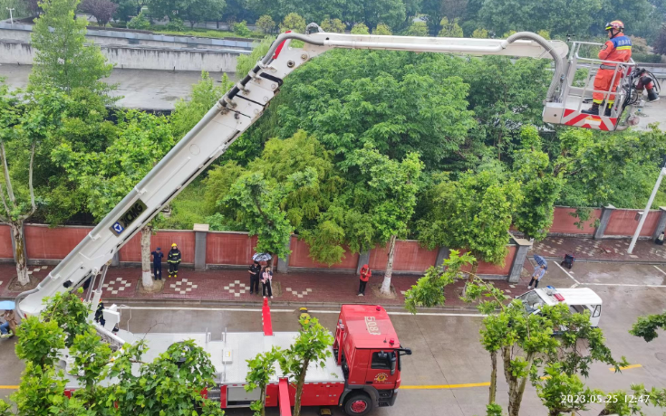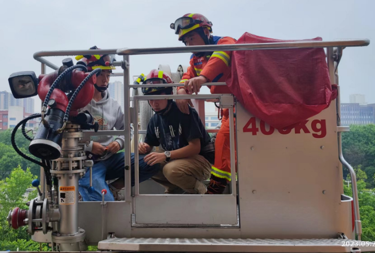 应急演练活动分为三个部分。第一部分为安全疏散,背景设置为14号公寓楼女生宿舍因使用大功率电器引发大火。演练中,同学们在工作人员指导下,保持镇静,弯腰低姿,俯身贴近地面,用湿毛巾捂住口鼻,紧张快速从最近安全出口有序疏散撤离。第二部分为安全救援,背景设置为10号公寓楼5层男生宿舍着火,被困两名学生撤离至西阳台等待,消防队云梯成功救出被困学生。第三部分为灭火器材演示和实操,消防员向师生们展示了各类实用消防技能,对灭火器具的使用方法、注意事项等作了现场讲解,并亲自指导同学们实际操作灭火器材。