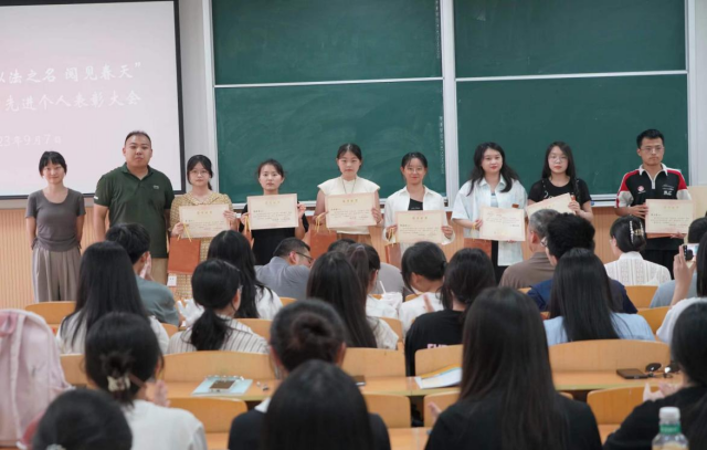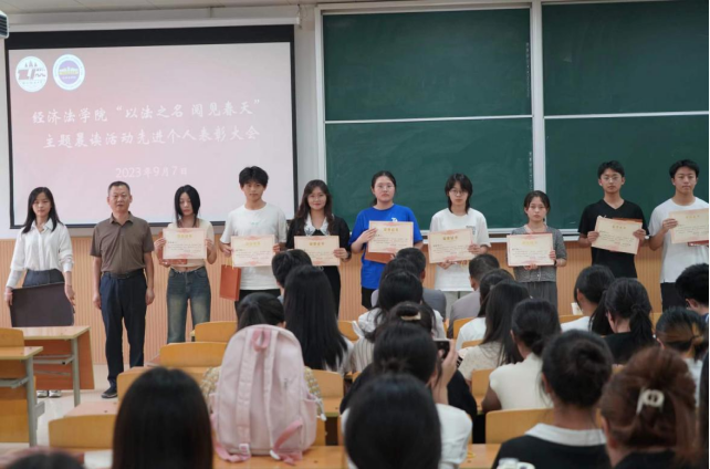 9月7日中午,经济法(知识产权)学院“以法之名,阅见春天”主题晨读活动先进个人表彰大会于天平楼BJ22教室成功召开。学院党委副书记李慧军、学院党委组织员李小斐、学院团委书记王文、学院团总支书记李冬冬、2020级辅导员来沅晖、2023级辅导员王可卓以及荣获晨读先进个人的50名同学参加大会,大会由团总支书记、2022级辅导员张兴浩老师主持。