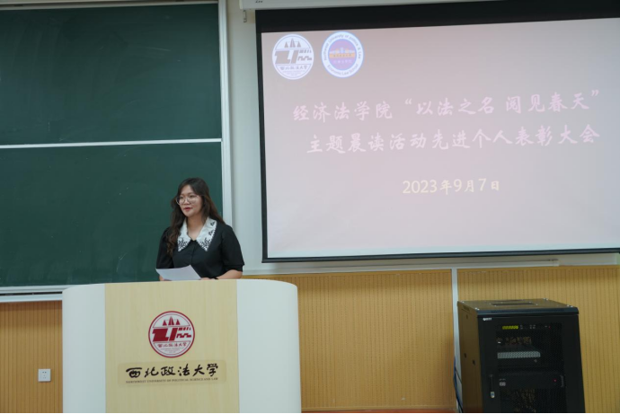颁奖过后,胡熠凝和吴沁霓作为晨读先进个人代表进行发言。胡熠凝同学谈及通过晨读活动阅读的《法治的细节》与《圆圈正义》,增强了对法学知识的了解,坚定了成为一名捍卫公平正义的法律人的决心。吴沁霓同学强调通过此次晨读活动不仅从苏力教授的《法治及其本土资源》一书中攫取了知识与智慧,更深刻体会到晨读带来的利好,克服懒惰心理,保持规律的作息,以高效学习、积极进取。