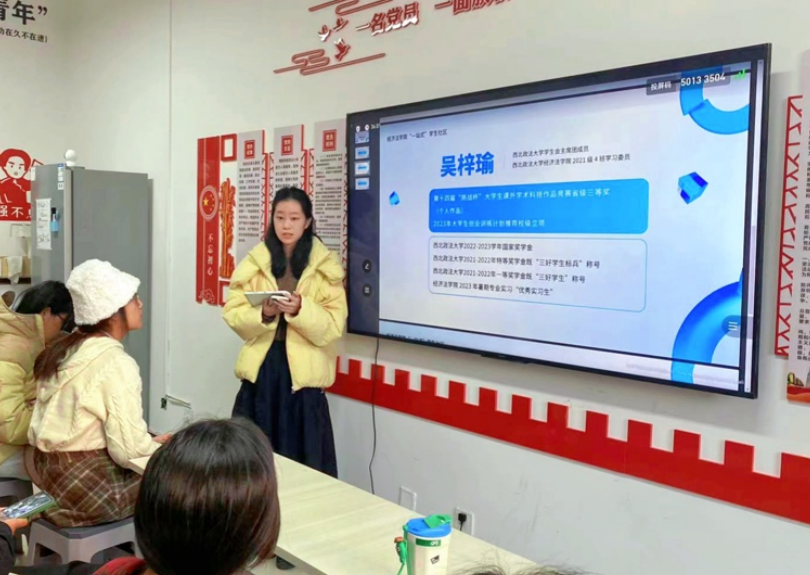 在14号公寓楼“一站式”学生社区开展创赛经验分享会。活动自通知发出后,吸引了来自不同学院的各个年级学生积极报名参加。分享会采取线上线下相结合的方式进行。2021级9班潘姿蓉负责组织协调本次活动并主持分享会。