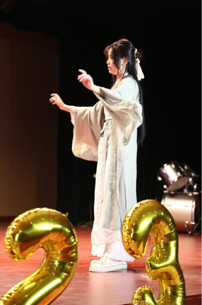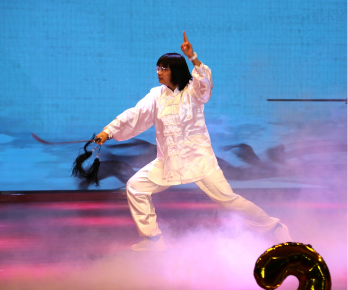 庄冉同学带来《论剑》武术表演。剑锋在舞台上回旋,衣袖舞动如风,出剑疾如闪电,就在这一刺、一撩、一劈之中,中华武术的精髓得到了淋漓极致的体现。