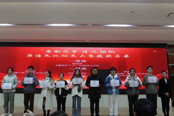 随后,进行了廉洁文化宣传教育月的总结表彰。今年廉洁文化宣传教育月自启动以来,得到了校纪委、党委宣传部的大力支持。活动期间,以“廉韵扬正气,洁行树新风”为主题,举办了第十届海峡两岸法律文化周——《话说张汤》话剧展演活动、“正气话廉洁,清风拂面来”校园广播栏目与轻听推送特辑、“洁行传美德,廉语暖民心”社区廉洁文化宣讲与志愿服务活动、“清韵传承、德馨盈校”家乡廉洁故事分享短视频大赛、“廉韵筑梦、清风扬帆”廉洁文化征文大赛、廉亭大讲堂等活动,数余名师生参与到活动中来,营造了学廉、崇廉、尚廉的良好氛围,有效传递了反腐倡廉的正能量。