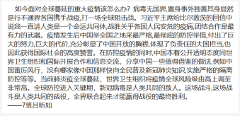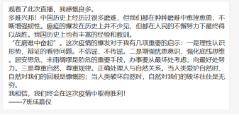 “在家上的这堂线上思政课,让我感触很深,四位老师在课堂上讲述的战役内容,真实而动人,温暖而有力,在这一刻大家心与心紧紧相连。”2019级马晓玮说道。2018级张伊岚同学感慨良多,她说一线医护人员、公安民警、社区工作者、外卖小哥等舍弃与家人团聚的机会,冒着被感染的风险默默地付出,把我们的生活点亮,当我们为在抗击疫情一线的人们所感动时,也应尽己所能为战胜疫情贡献微薄之力。2018级张雅然同学说这场战役让我们认识到一个真正的中国,一个足够有力量、有担当的大国,我从未如此感恩这场战“疫”,生于中国的土壤是如此令人骄傲,期待在疫情中蜕变的我们艰苦奋斗,让青春的一代担当起这份责任。2017级叶竞择说:“一个国家是否强大,就要看当国家面临困难时领导者做出的判断和指引,这次疫情使我们充分体会到共产党领导和社会主义制度的优越性。”2019级研究生赵普祥说:“疫情严重影响了广大人民群众的生命安全和身体健康,影响他们的正常生活,我们也需要认识到,在党中央的号召下,全国上下万众一心,一定会度过难关,武汉加油,中国加油!”