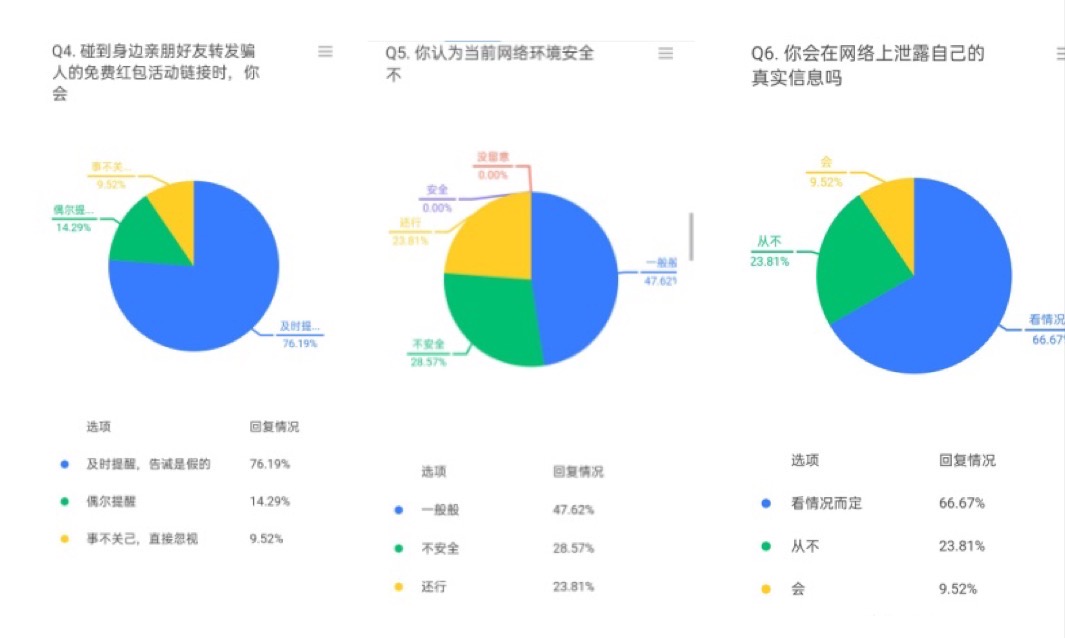 制作了网络安全调查问卷,共发放问卷500余份,开展线上线下双向调查活动,并对调查数据进行分析汇总,了解同学对网络安全知识的掌握程度与防范意识,积极与同学交流沟通,使同学们的安全意识与自我保护意识进一步增强。