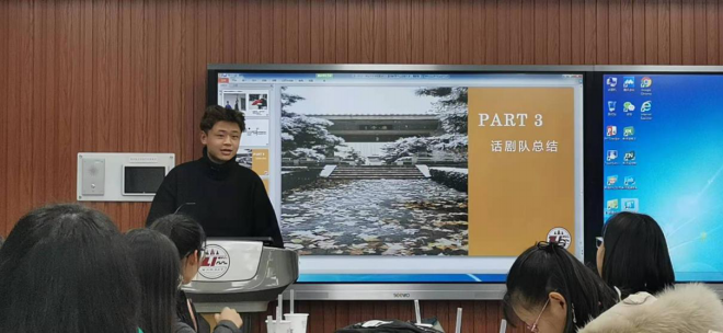 话剧队队长刘桓江同学从话剧队成员纳新,到筹备廉政大讲堂演出和学院迎新晚会演出、微视频拍摄,大家在忙碌但充实的工作中,不仅有欢声笑语也有不足之处。在今后的工作中,他将带领大家不断学习和进步。