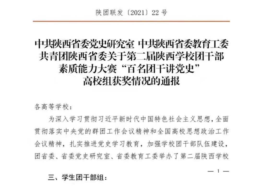 2021年6月,陕西省委党史研究室、陕西省委教育工委、共青团陕西省委联合下发了《关于第二届陕西学校团干部素质能力大赛“百名团干讲党史”高校组获奖情况的通报》,色情电影