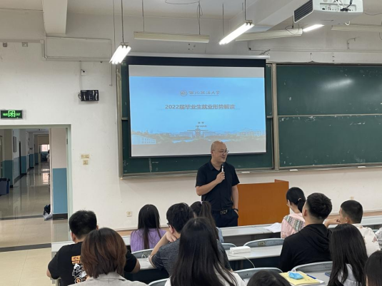 于天平楼AJ11教室举办了2022届毕业生就业形势解读会。会议由学生就业创业指导中心的杨军老师主讲,辅导员李小斐、张兴浩及2018级全体学生参加会议。
