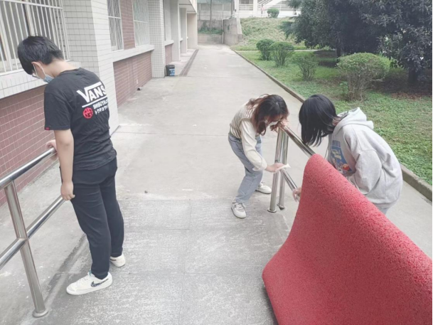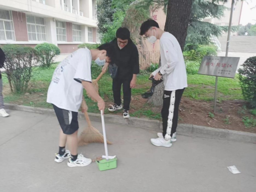 组织2022级新生在学院环境区开展卫生清洁活动。