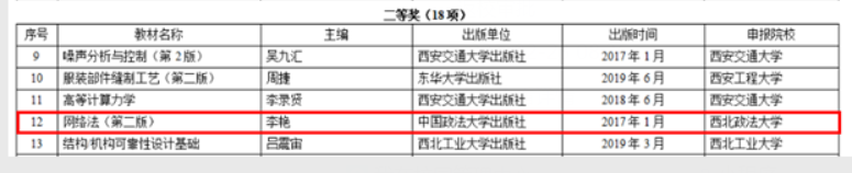 此前,色情电影 杨巧教授主编教材《知识产权法学》获得2009年二等奖,郭捷教授主编教材《劳动法与社会保障法》获得2011年一等奖,李永宁教授、李集合教授、韩丽琳教授主编教材《环境资源法学》获得2016年二等奖。