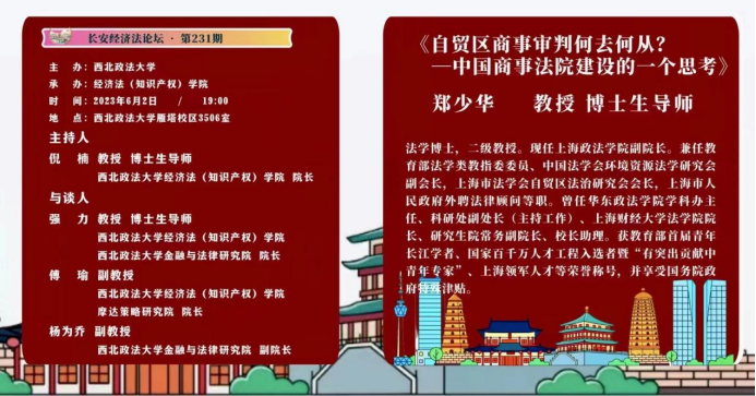 雁塔校区三号教学楼3506室举行。本期学术论坛特邀上海政法学院副院长,二级教授、博士生导师郑少华教授发表主题为《自贸区商事审判何去何从?——中国商事法院建设的一个思考》的演讲。