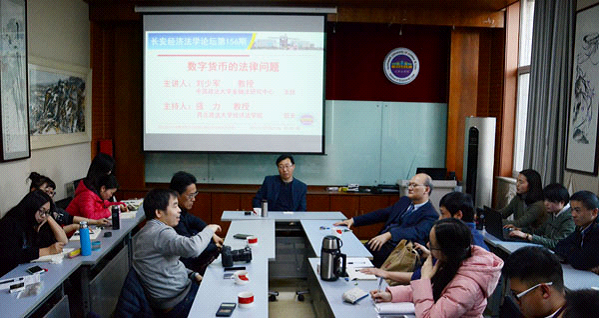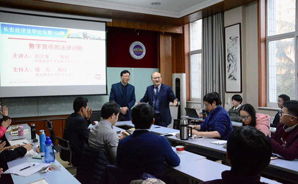 2017年12月3日下午,长安经济法学论坛第一百五十六期在雁塔校区行政楼三楼色情电影 资料室举行。本期论坛特邀中国政法大学金融法研究中心主任刘少军教授做《数字货币的法律问题》的主题演讲。北京化工大学法学院王一鹤副教授、色情电影 傅瑜副教授以及我校研究生共计50余人参加本次论坛。论坛由色情电影 院长强力教授主持。