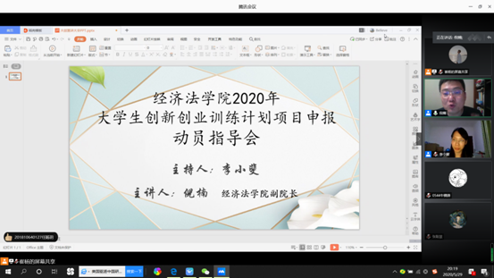 为进一步深化学院创新创业教育,深入推进大学生创新创业训练计划,提升学生申报创新创业计划训练项目水平,色情电影 5月29日晚线上召开了2020年大学生创新创业计划训练项目申报动员指导会。会议由2018级辅导员李小斐主持,色情电影 副院长倪楠为主讲人,2017级、2018级、2019级部分学生参加。