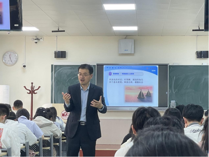 面对2020级同学,张荣刚从“管理思维——有规划的人生更美、黄金阶段——踏实的人生更稳健、关键环节——高阔的旅途更长远、收获幸福——管理思维的人生目标”四个方面出发,向大家强调了大学期间进行自我管理的重要性。张荣刚勉励大家要在尊重自我中努力追求自己的理想,在尊重自我的同时也应遵循社会,尊重社会对自身的期望,在社会中实现自己的人生价值。最后张荣刚向同学们寄予了殷切的期望,他希望大家能够牢牢把握大学这一学习与成长的黄金期,始终保持着努力奋进、乐观向上的态度,不断充实、沉淀自我,只争朝夕、不负韶华。