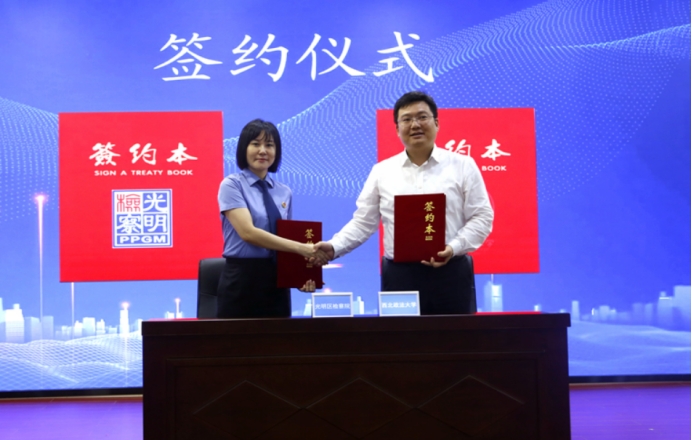 签约仪式上,经济法(知识产权)学院院长倪楠与光明区检察院副检察长吴艳妮代表校检双方共同签署合作协议。