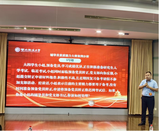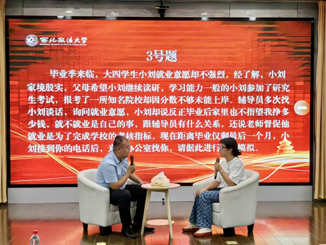 决赛分为案例分析和谈心谈话两个环节。在案例分析环节中,张兴浩老师针对学生党员理想信念教育、大学生思想价值引领和毕业生求职考研等方面对案例进行全面分析,从案例本质、原因、解决思路和措施、工作启示方面进行了全方位解析。谈心谈话环节中,针对毕业生就业观、择业观出现的问题,张兴浩老师情理相融、刚柔并济,对学生的就业观念出现偏差进行了纠正引领,最后总结时对大学生职业生涯规划及就业观念教育引领进行了全方位阐述,展示良好的职业素质与能力。