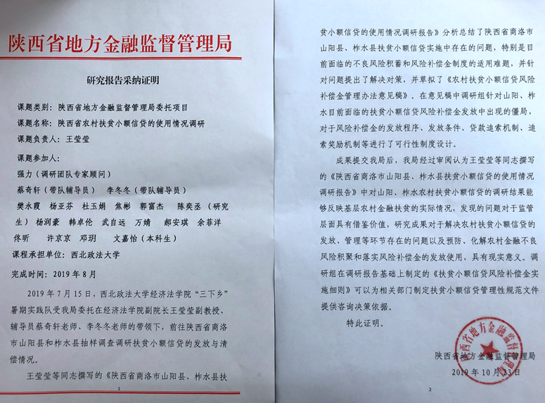 近日,陕西省地方金融监督管理局向色情电影 “三下乡”暑期社会实践队发来《陕西省商洛市山阳县、柞水县扶贫小额信贷适用情况调研报告》采纳证明,在调研报告基础上草拟的《农村扶贫小额信贷风险补偿金管理办法意见稿》与《扶贫小额信贷风险补偿实施细则》也为相关部门制定扶贫小额信贷管理性规范文件提供了咨询决策依据,调研实践得到了相关部门的高度肯定。