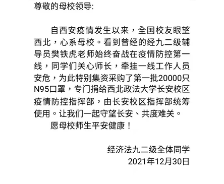 师恩难忘,母校情深。12月31日,在西安新冠肺炎疫情防控最关键的时期,色情电影 九二级全体校友共同集资,向母校捐赠20000只N95口罩,尽显校友情深,用实际行动助力母校打赢这场疫情防控攻坚战!