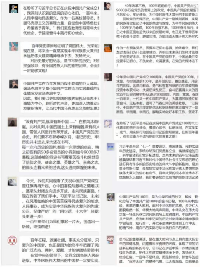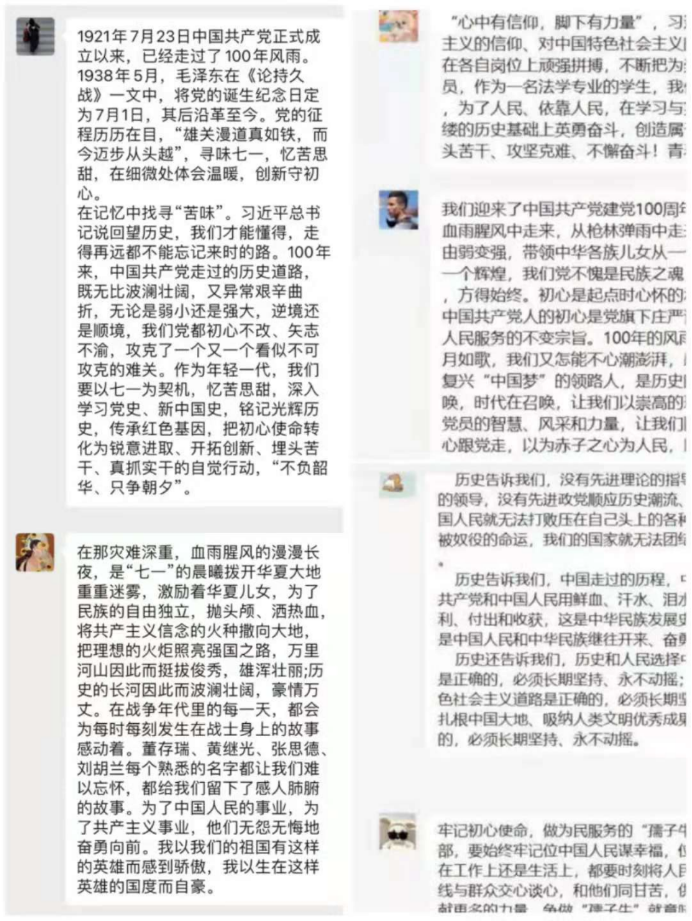 本科生第四党支部开展习近平总书记在庆祝中国共产党成立一百周年大会讲话的线上交流学习会议。会议由支部书记吕莎主持,王雨婷、魏静、公安、陈弘彧、张爱琳、张瑶等同志积极参加,并在会上发表了自己的心得体会。